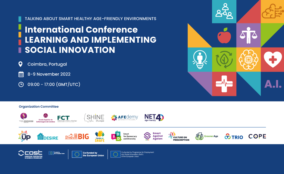 On November 8th and 9th, we will talk about Smart Healthy Age-friendly Environments and Social Innovation in Coimbra. This conference is co-organised by the Nursing School of Coimbra, SHINE 2Europe and AFEdemy, and aims to share and discuss approaches, projects and best practices related to Social Innovation and how to implement and develop healthier and inclusive environments.